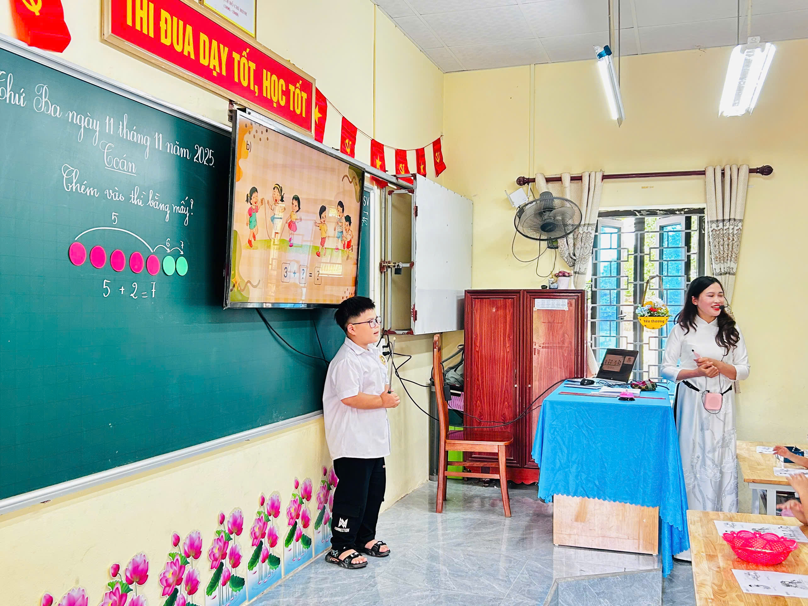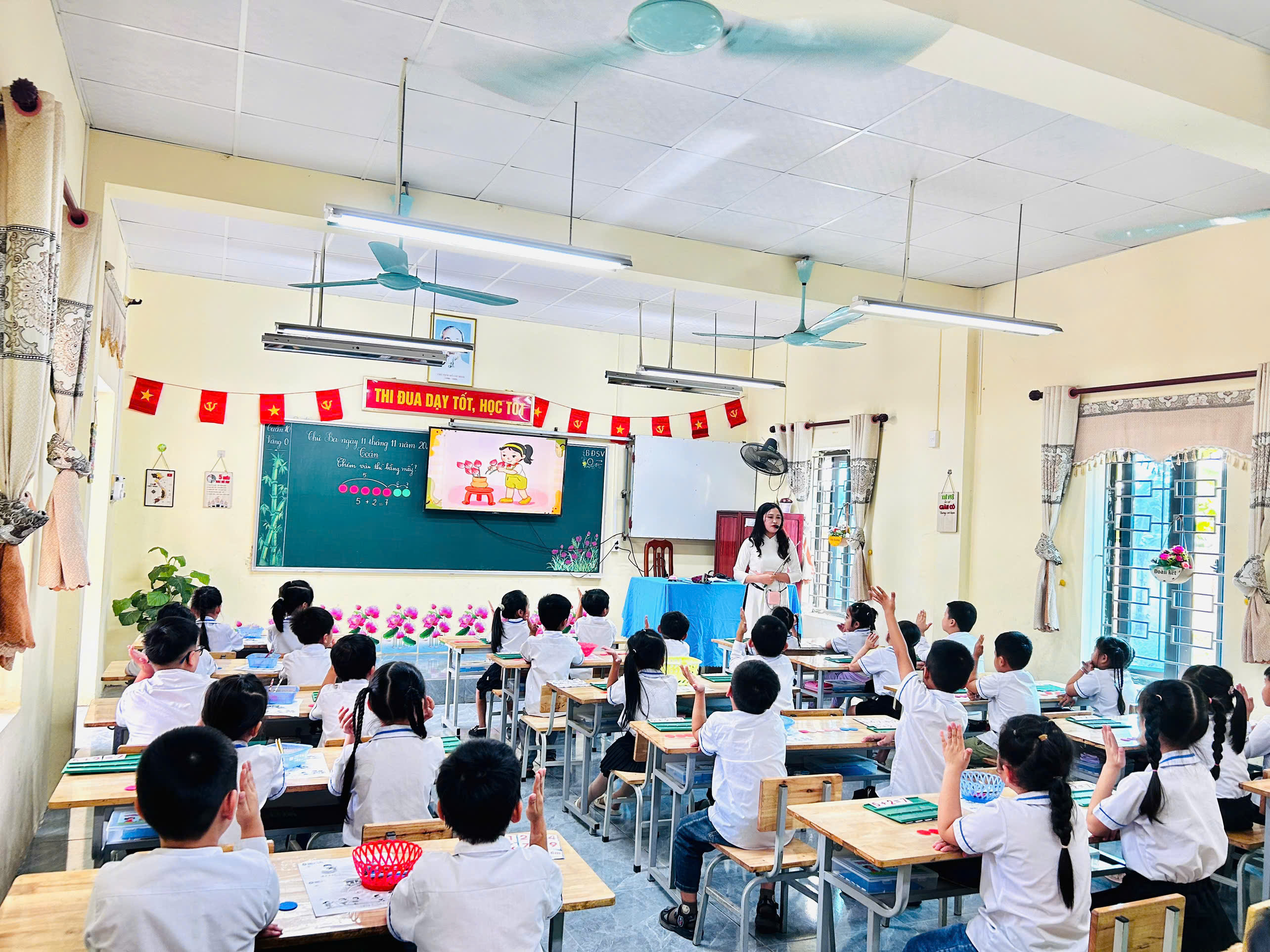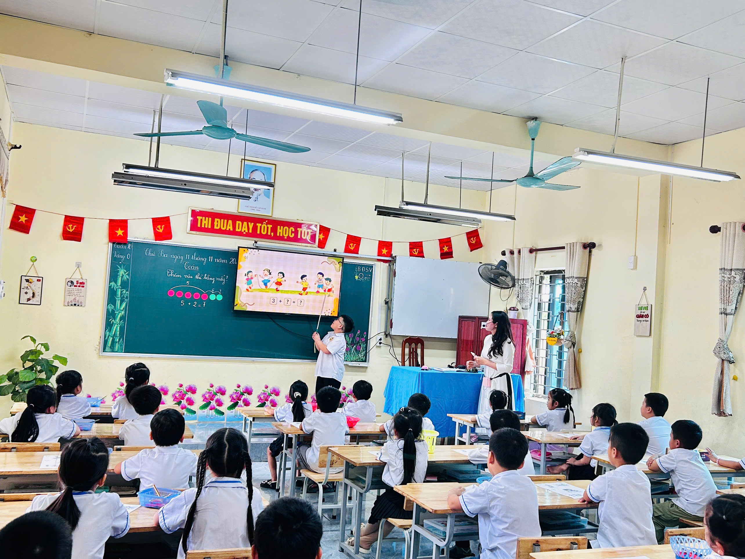 Ngay từ đầu giờ, không khí buổi sinh hoạt đã trở nên sôi nổi và đầy hứng khởi với tiết dạy minh họa bài Toán “Thêm vào thì bằng mấy?” do cô giáo Nguyễn Thị Hằng – giáo viên Trường Tiểu học Thống Kênh – trực tiếp giảng dạy cho học sinh lớp 1A.