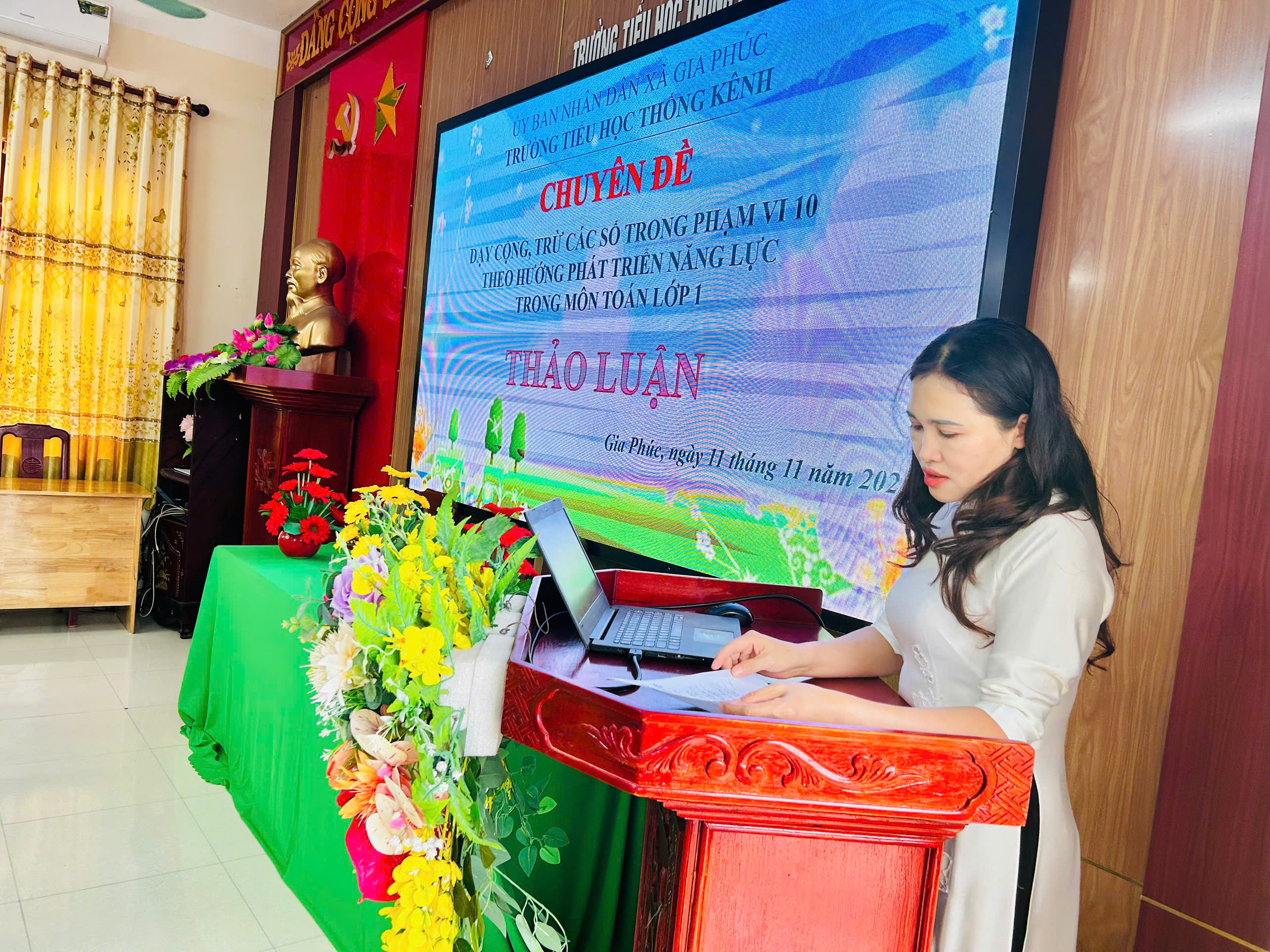 Tiếp nối phần dự giờ, cô giáo Nguyễn Thị Linh trình bày báo cáo lý thuyết chuyên đề với nội dung “Dạy cộng, trừ các số trong phạm vi 10 theo hướng phát triển năng lực cho học sinh trong môn Toán lớp 1”.Báo cáo được chuẩn bị công phu, kết hợp giữa lý luận và thực tiễn giảng dạy tại cơ sở, tập trung vào các giải pháp then chốt như: Dạy học thông qua thao tác trực quan, giúp học sinh “học bằng tay – hiểu bằng mắt – ghi nhớ bằng trải nghiệm”;Tổ chức trò chơi Toán học để củng cố kiến thức và phát triển năng lực hợp tác, giao tiếp; Thiết kế bài học gắn với tình huống thực tế;Ứng dụng công nghệ thông tin và phối hợp chặt chẽ với phụ huynh trong việc rèn luyện kỹ năng cho học sinh tại nhà. Các giải pháp đều hướng tới mục tiêu cốt lõi: giúp học sinh không chỉ biết làm phép tính đúng mà còn hiểu, vận dụng và yêu thích môn Toán – góp phần hình thành những năng lực, phẩm chất quan trọng ngay từ lớp 1.