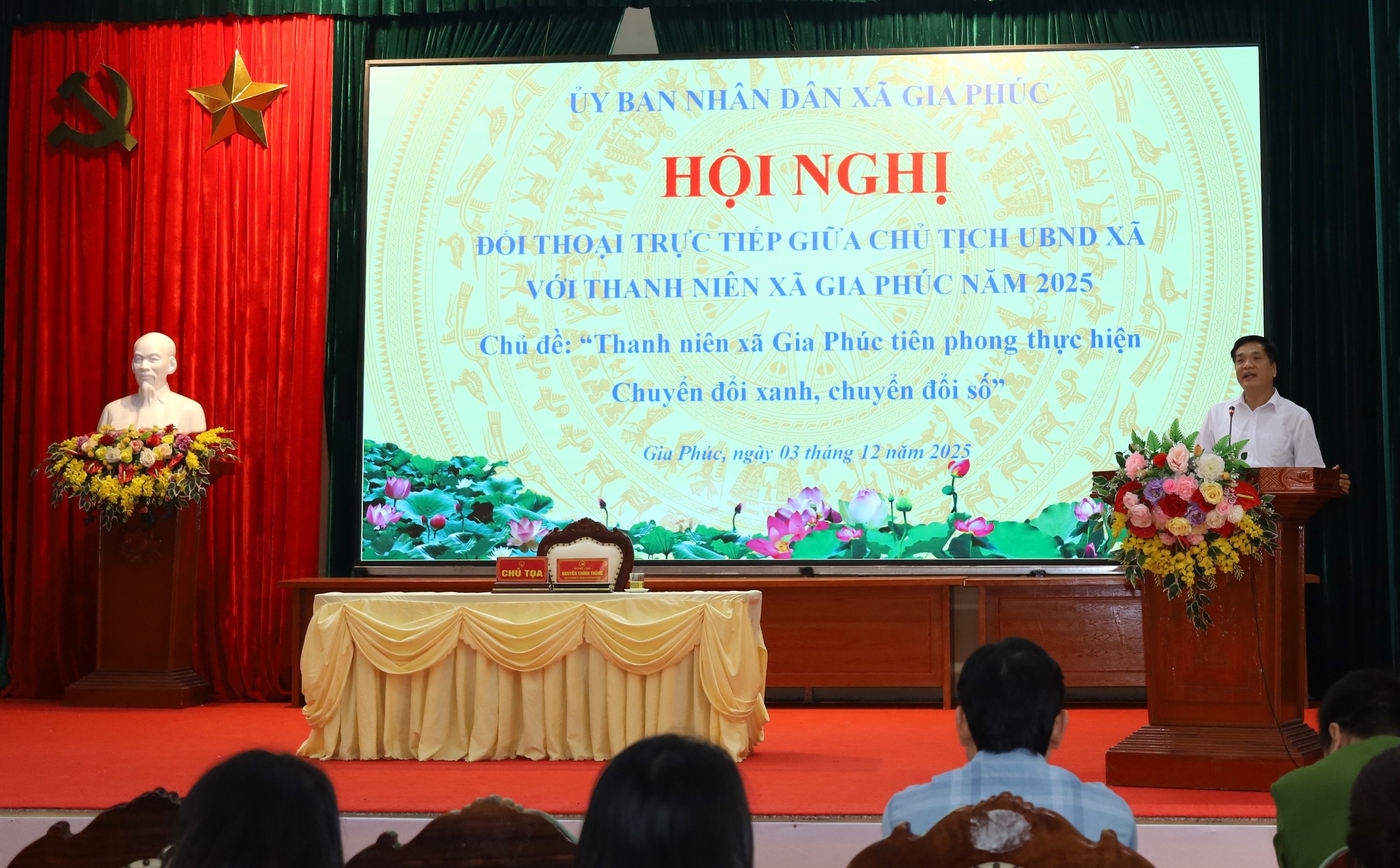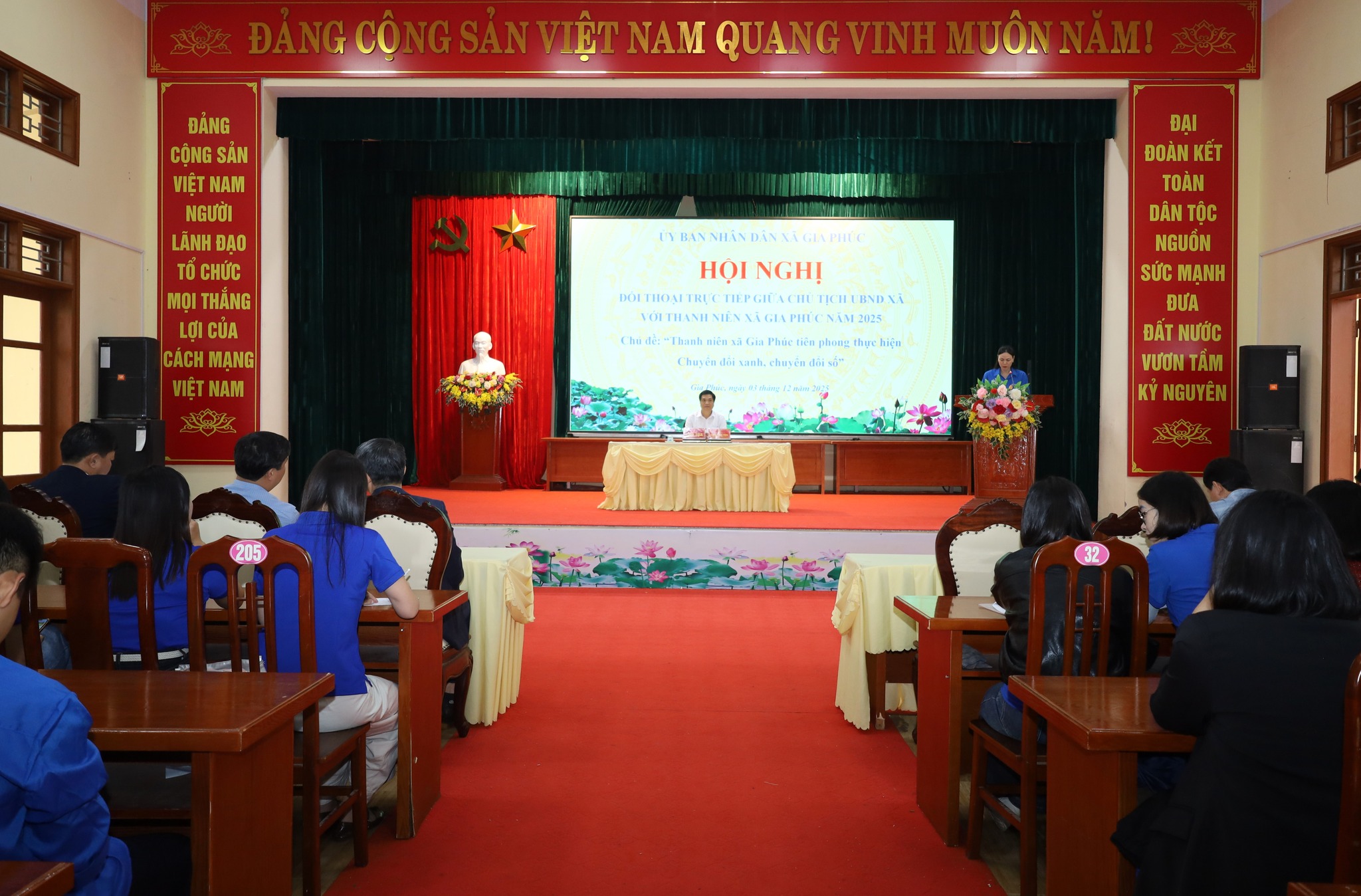 Chiều ngày 03/12/2025, tại Nhà văn hoá Trung tâm xã Bái Thượng, UBND xã Gia Phúc tổ chức Hội nghị đối thoại trực tiếp giữa đồng chí Nguyễn Chính Thống - Phó Bí thư Đảng uỷ, Chủ tịch UBND xã với thanh niên năm 2025, với chủ đề “Thanh niên Gia Phúc tiên phong thực hiện chuyển đổi xanh, chuyển đổi số”. Dự Hội nghị có các đồng chí đại diện các cơ quan thành phố, Thường trực Đảng uỷ, Ban thường vụ Đảng ủy, HĐND, UBND, UB MTTQ Việt Nam xã, lãnh đạo các phòng chuyên môn, các tổ chức chính trị – xã hội cùng đông đảo đoàn viên, thanh niên tiêu biểu. Sự quan tâm của các cấp lãnh đạo đã tạo nên không khí trang trọng nhưng cũng cởi mở, thể hiện cam kết đồng hành cùng thế hệ trẻ trong chặng đường đổi mới quê hương.