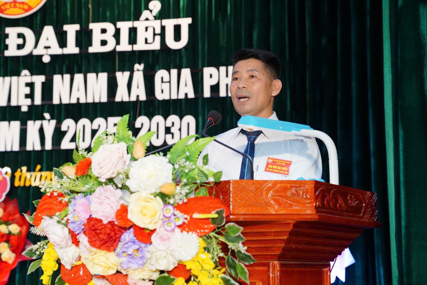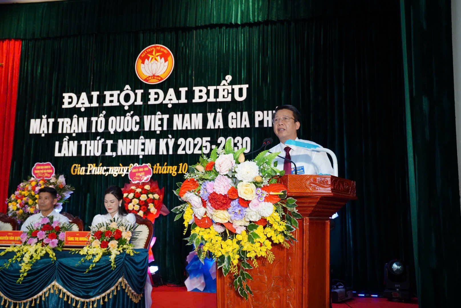Đồng chí Đỗ Văn Tiến - Bí thư Đảng ủy, Chủ tịch Hội đồng Nhân dân xã Gia Phúc, trong bài phát biểu tại Đại hội đã nhấn mạnh, Mặt trận cần gắn bó chặt chẽ với Đảng bộ, chính quyền và nhân dân, đẩy mạnh các phong trào thi đua yêu nước, xây dựng khu dân cư văn hóa, góp phần thực hiện thắng lợi Nghị quyết Đại hội Đảng bộ xã Gia Phúc lần thứ I, nhiệm kỳ 2025 - 2030, Đồng thời đồng chí Bí thư Đảng ủy, Chủ tịch Hội đồng Nhân dân xã cũng bày tỏ niềm tin rằng, với truyền thống đoàn kết của xã Gia Phúc, Mặt trận sẽ tiếp tục là cầu nối vững chắc giữa Đảng, chính quyền và nhân dân, thúc đẩy xã Gia Phúc phát triển nhanh, toàn diện và bền vững.