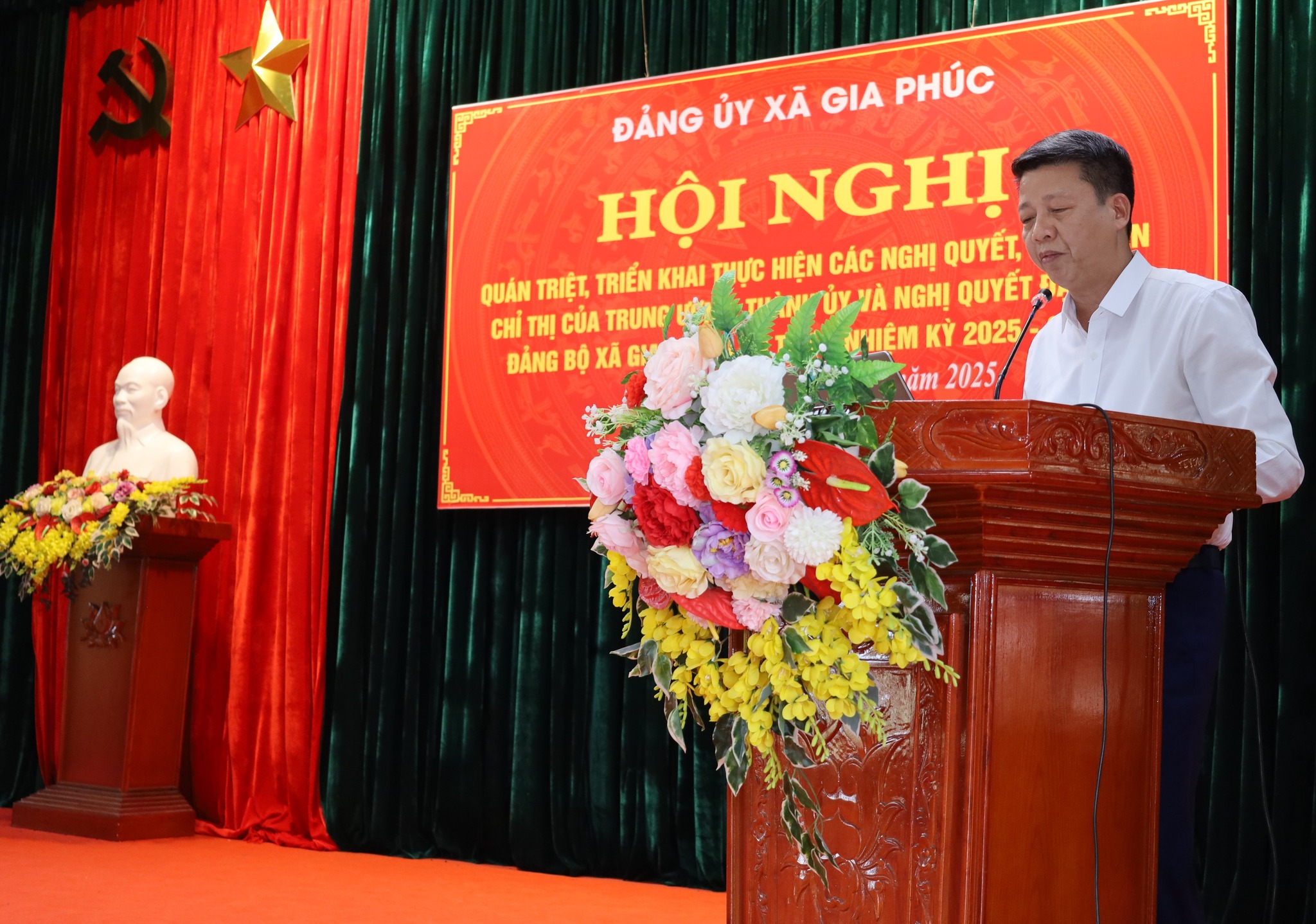 Phát biểu bế mạc Hội nghị, đồng chí Đồng chí Đỗ Văn Tiến – Bí thư Đảng ủy, Chủ tịch HĐND xã yêu cầu các chi bộ, ban ngành, đoàn thể và cán bộ, đảng viên trong toàn Đảng bộ tiếp thu đầy đủ các nội dung được quán triệt, tiếp tục tổ chức học tập, triển khai thực hiện nghiêm túc tại đơn vị mình; đồng thời đẩy mạnh công tác tuyên truyền, phổ biến sâu rộng trong cán bộ, đảng viên và nhân dân, tạo sự thống nhất về nhận thức và hành động, quyết tâm thực hiện thắng lợi Nghị quyết Đại hội Đảng bộ xã Gia Phúc lần thứ I, nhiệm kỳ 2025–2030.