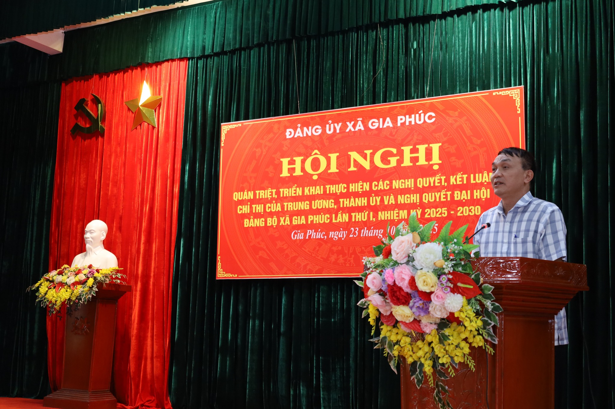 Tại Hội nghị, các đại biểu đã được nghe: Đồng chí Đỗ Văn Tiến – Bí thư Đảng ủy, Chủ tịch HĐND xã trình bày Nghị quyết Đại hội đại biểu Đảng bộ xã Gia Phúc lần thứ I, nhiệm kỳ 2025–2030; Đồng chí Phạm Thị Hải – Phó Bí thư Thường trực Đảng ủy giới thiệu Chương trình hành động thực hiện Nghị quyết Đại hội Đảng bộ xã lần thứ I; Đồng chí Nguyễn Chính Thống – Phó Bí thư, Chủ tịch UBND xã trình bày Kế hoạch triển khai, quán triệt học tập Nghị quyết Đại hội Đảng bộ xã lần thứ I, nhiệm kỳ 2025–2030; Đồng chí Nguyễn Văn Chuyển – Ủy viên Ban Thường vụ, Phó Chủ tịch Thường trực UBND xã quán triệt Kế hoạch số 07-KH/TU ngày 25/7/2025 của Ban Thường vụ Thành ủy Hải Phòng về thực hiện Nghị quyết số 68-NQ/TW ngày 04/5/2025 của Bộ Chính trị về phát triển kinh tế tư nhân; Đồng chí Vũ Thị Dịu – Ủy viên Ban Thường vụ, Phó Chủ tịch HĐND xã triển khai Chỉ thị số 02-CT/ĐU ngày 16/9/2025 của Ban Thường vụ Đảng ủy về lãnh đạo, chỉ đạo công tác bầu cử đại biểu Quốc hội khóa XVI và đại biểu HĐND các cấp nhiệm kỳ 2026–2031.
