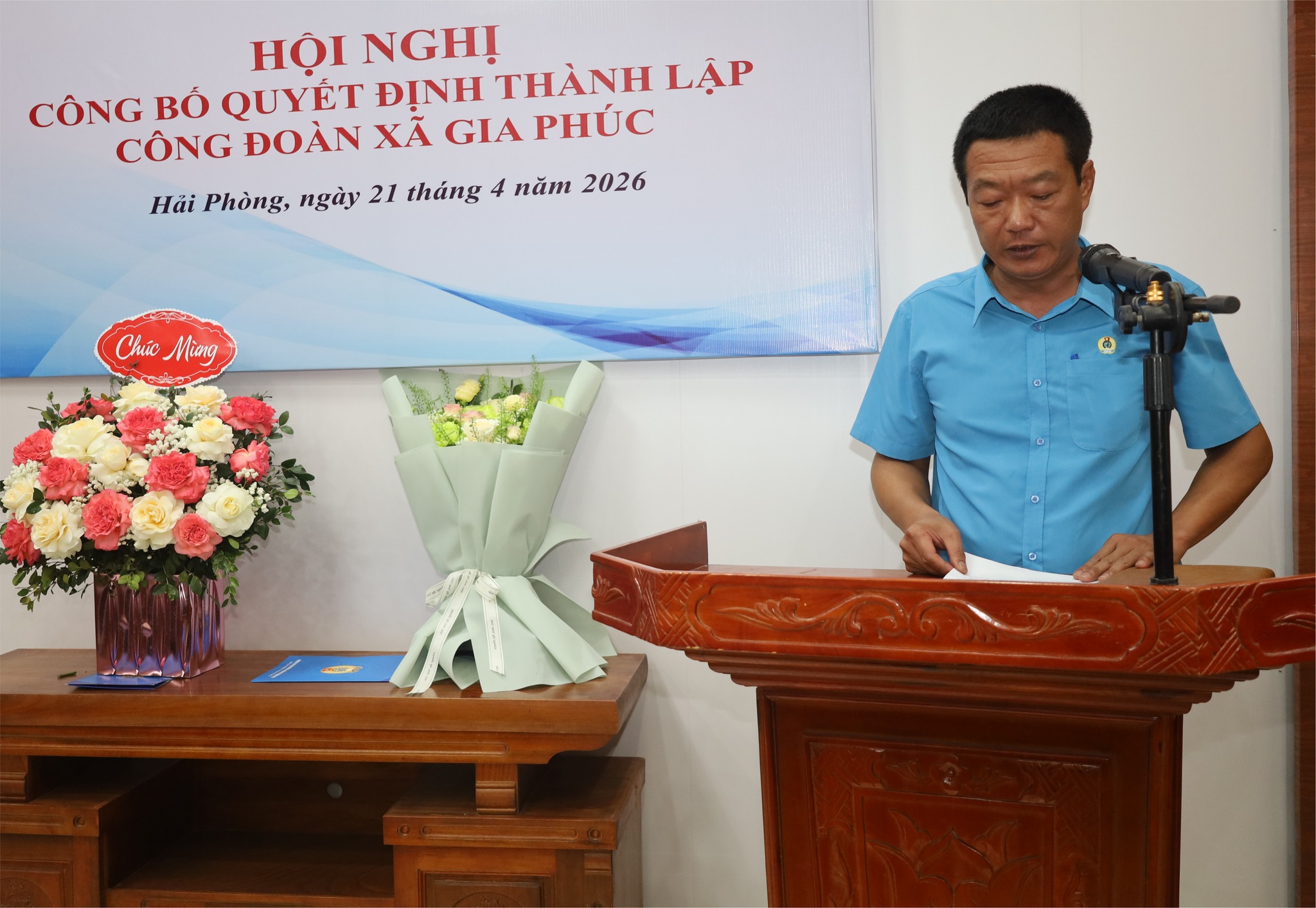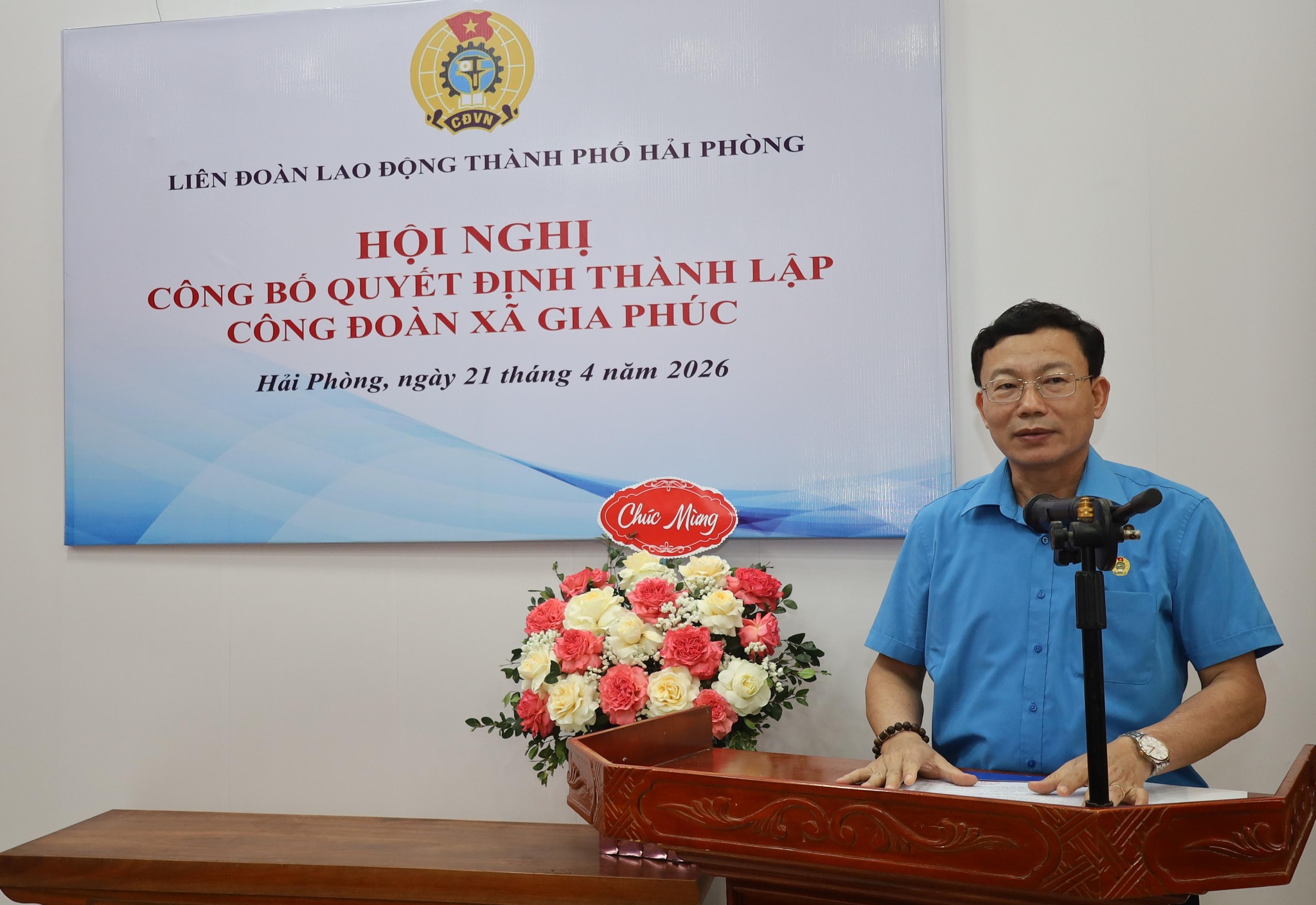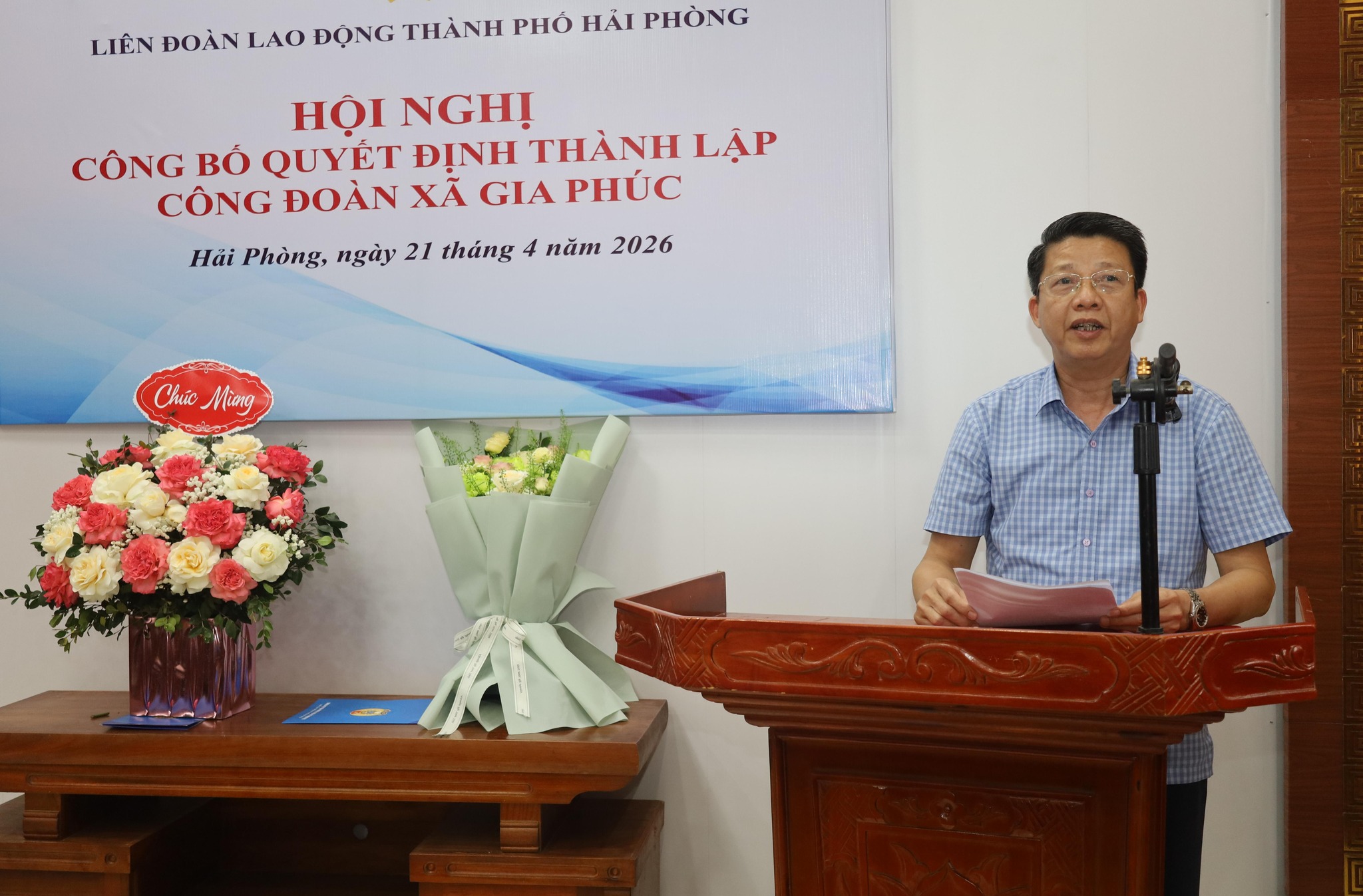 Chiều ngày 21 tháng 4 năm 2026, tại Trụ sở Đảng ủy - HĐND - UBND xã Gia Phúc, Liên đoàn Lao động thành phố Hải Phòng tổ chức Hội nghị công bố quyết định thành lập Công đoàn xã Gia Phúc.